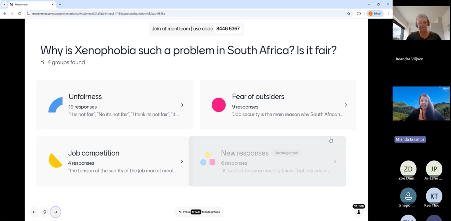 The shared online class on Microsoft Teams is one of her strongest tools. These sessions bring students from Potchefstroom, Mahikeng and Vanderbijlpark together in one digital classroom. Mentimeter is used throughout to keep students active. Anonymous participation removes fear, and real time grouping of answers helps Mianda identify patterns quickly and respond immediately to misconceptions.