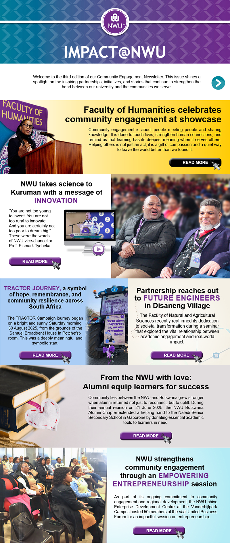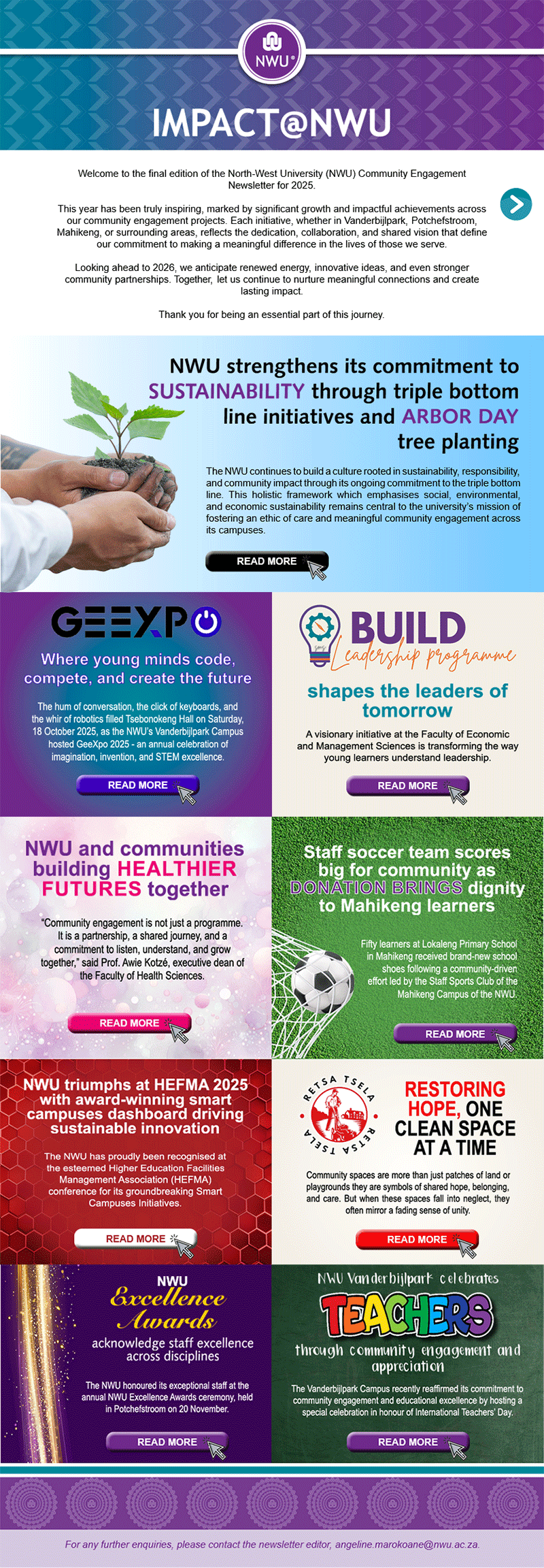 The NWU is proud to present the first edition of our community engagement newsletter, IMPACT@NWU. This quarterly publication brings you updates on the NWU's initiatives, events and projects that seek to build a stronger relationship between the university and our local communities. Every edition will feature details about our sustainability initiatives, upcoming community activities, volunteering opportunities and how you can become an active part of the NWU's commitment to serving our community.
